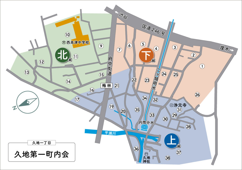 久地第一町内会は「北組」「上組」「下組」の3支部で構成されています。