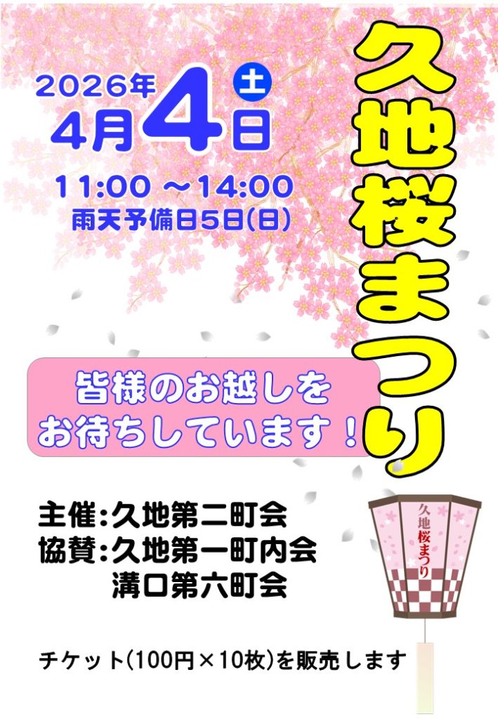 2026年3月21日 / 最終更新日 2026年4月5日 町内会 2026年4月4日 久地桜まつり このイベントは終了しています かすみ堤の桜の下、美味しい食べ物や飲み物を片手に、楽しいひとときを過ごしませんか?地元町会による出店で、美味しい食べ物や飲み物をご用意!お子様から大人まで楽しめる、地域交流の場です。 日時:2026年4月4日(土)11:00~14:00雨天予備日 4月5日(日)場所:久地かすみ堤 主催:久地第二町会協賛:久地第一町内会 溝口第六町会